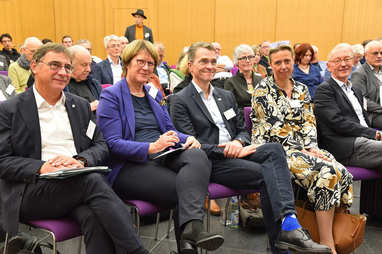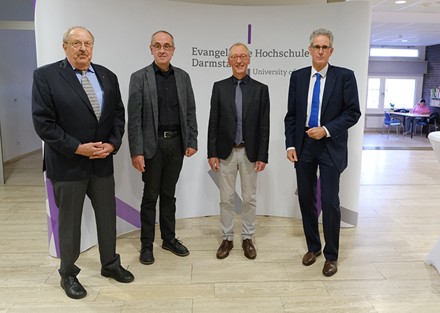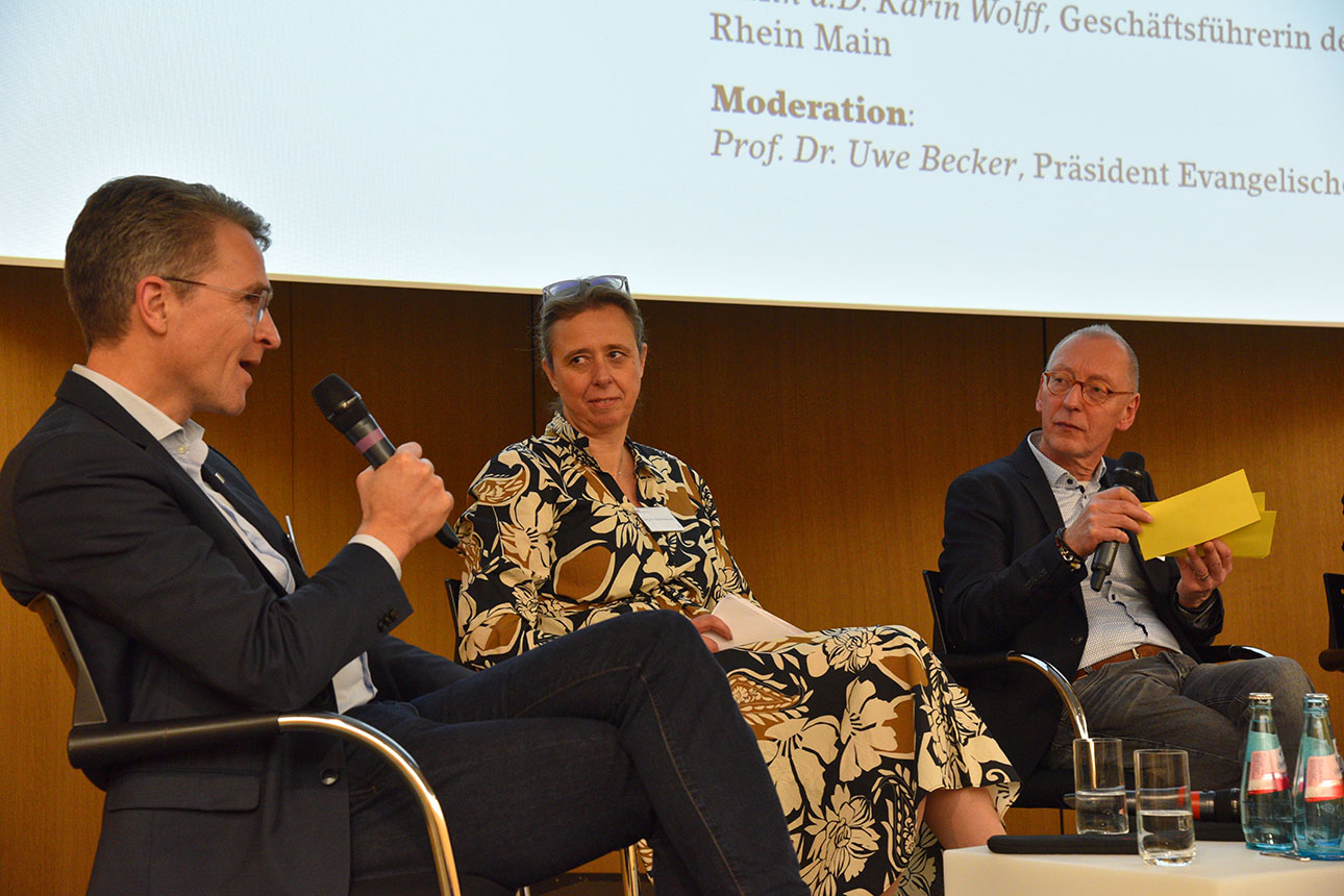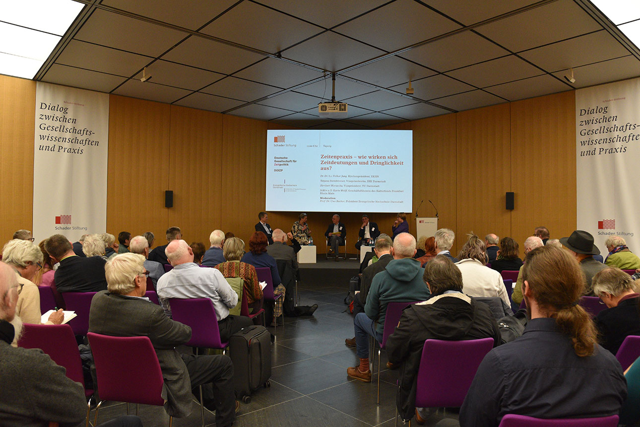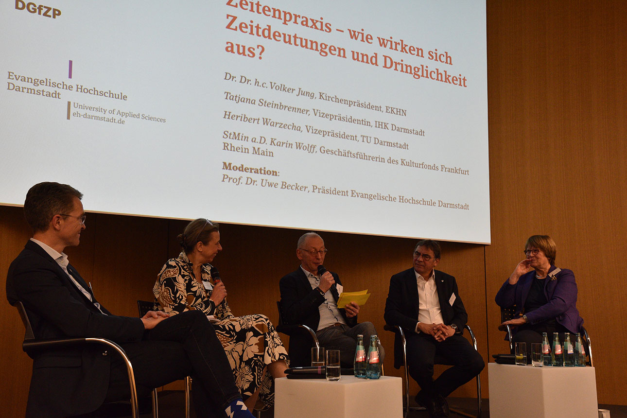 Die Zeiten ändern sich in immer neuen Tempi. Wahrnehmung und Wirklichkeit von Zeit verschiebt sich, Politiken und Politisierungen ringen und spielen mit der Zeit. Die Jahrestagung der Deutschen Gesellschaft für Zeitpolitik in Kooperation mit der Schader-Stiftung und der Evangelischen Hochschule Darmstadt wurde mit einem öffentlichen Podium geschlossen, zu dem ca. 70 interessierte Bürger:innen kamen – Kirchenpräsident Dr. Volker Jung, IHK-Vizepräsidentin Tatjana Steinbrenner, TU-Vizepräsident Prof. Dr. Heribert Warzecha und Staatsministerin a.D. Karin Wolff diskutierten unter Moderation von EHD-Präsident Prof. Dr. Uwe Becker über die Dringlichkeit politischer Maßnahmen angesichts globaler Krisen wie Krieg, Pandemie und Klimawandel.