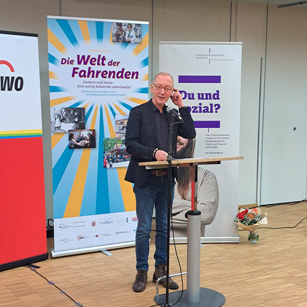 „Kirmes, Zirkus, Weihnachtsmärkte - was wäre das alles ohne die, die aufbauen und ranschaffen, brutzeln, braten und ausschenken, Shows bieten und Tausenden von Kindern die Runden auf dem Karussell, dem Riesenrad oder der Geisterbahn ermöglichen?“, fragt zu Recht EHD-Präsident Uwe Becker anlässlich der Eröffnung einer Ausstellung zur Welt der Fahrenden. Es sei paradox: „Während die einen feiern, genießen, tanzen, essen, trinken und nicht wenige über den Durst, sind die anderen im Hintergrund, unauffällig, malochen, manchmal die ganze Familie bis spät in die Nacht. Der Konsum der einen braucht den arbeitssamen Tribut der anderen.“ Ihre Lebenswelt sei von der „sublime Art der Ausgrenzung, des Übersehenwerdens, des, wie es der Soziologe Andreas Reckwitz nennt, Sozialen Todes“ geprägt. Zwölf Schautafeln geben Einblick in ihre Lebensweise und ihre Alltagsprobleme.