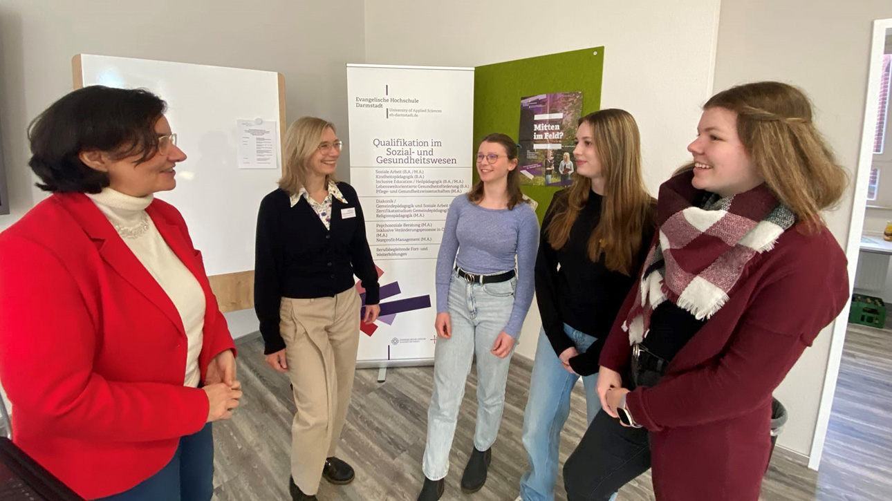 (Schwalmstadt, 31.01.2024) Familiär statt überfüllt, Praxisnähe statt reiner Theorie: Das macht das Studium der Evangelischen Hochschule Darmstadt (EHD) am modernen Studienstandort Schwalmstadt-Treysa auf dem Campus Hephata aus. Am Hochschulerkundungstag gaben Prodekanin Prof. Dr. Susanne Gerner, Prof. Dr. Gotlind Ulshöfer und Diakonin Kathrin Rühl den Studieninteressierten Einblicke in das Bachelor-Studium Soziale Arbeit (sieben Semester) sowie in den Doppel-Bachelor Diakonik/Gemeindepädagogik und Soziale Arbeit (neun Semester).